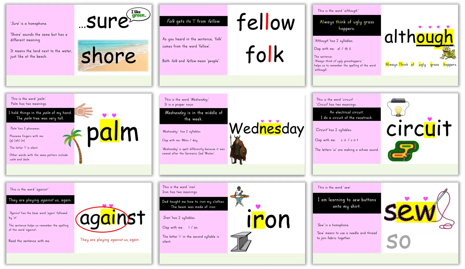 There are several ways to learn the irregular spellings in heart words. Sometimes it’s easiest to learn the letter order through the arm-tapping or syllable-tapping routine alone. But, with other words, we could use spelling voice, the word’s history (etymology), its word family, a mnemonic or its morphology to create a memory hook for students to make its spelling more memorable. In 2026, we’ve dived in and set up the slides to teach heart words using one of these strategies, which we call ‘glasses’.