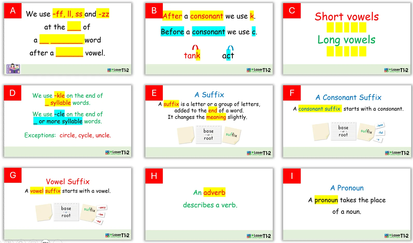 Slide F: Write ‘helpful’, ‘kindness’ and ‘helped’ on the board: students write the word(s) with the consonant suffix on their boards and chin it.